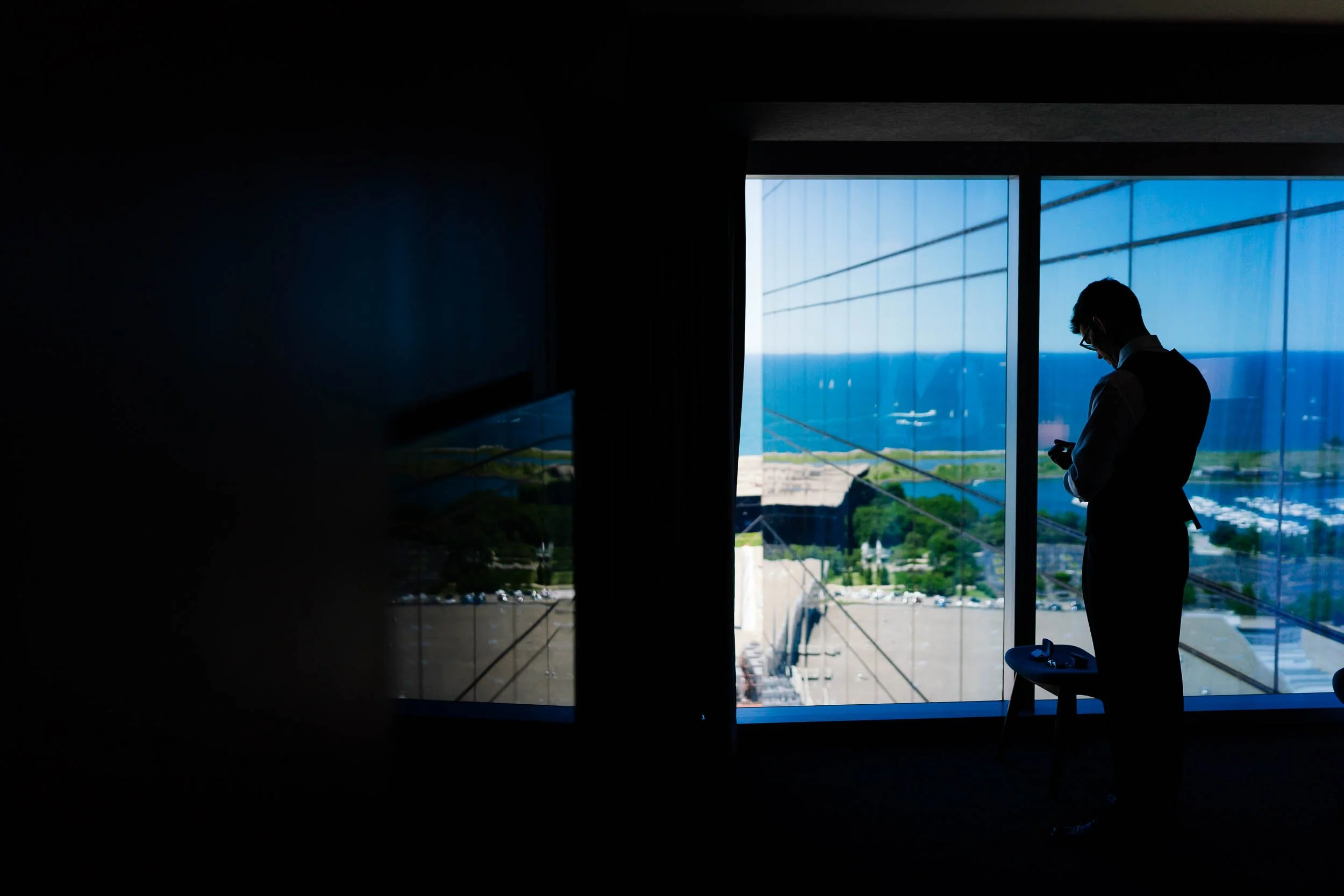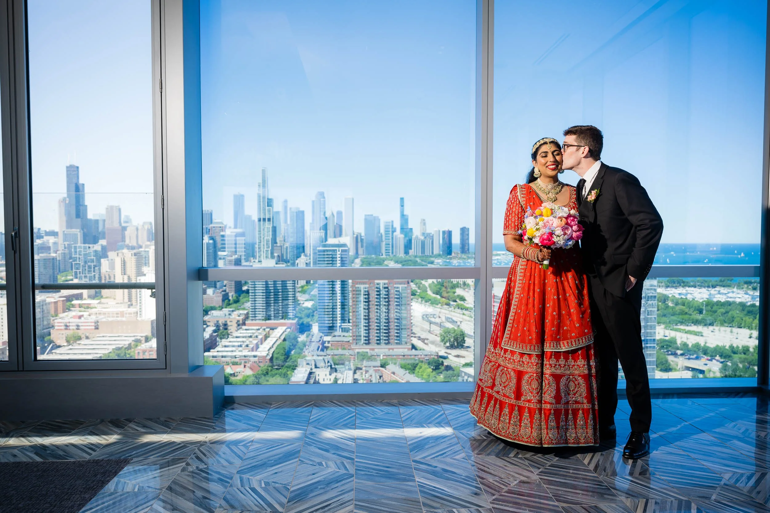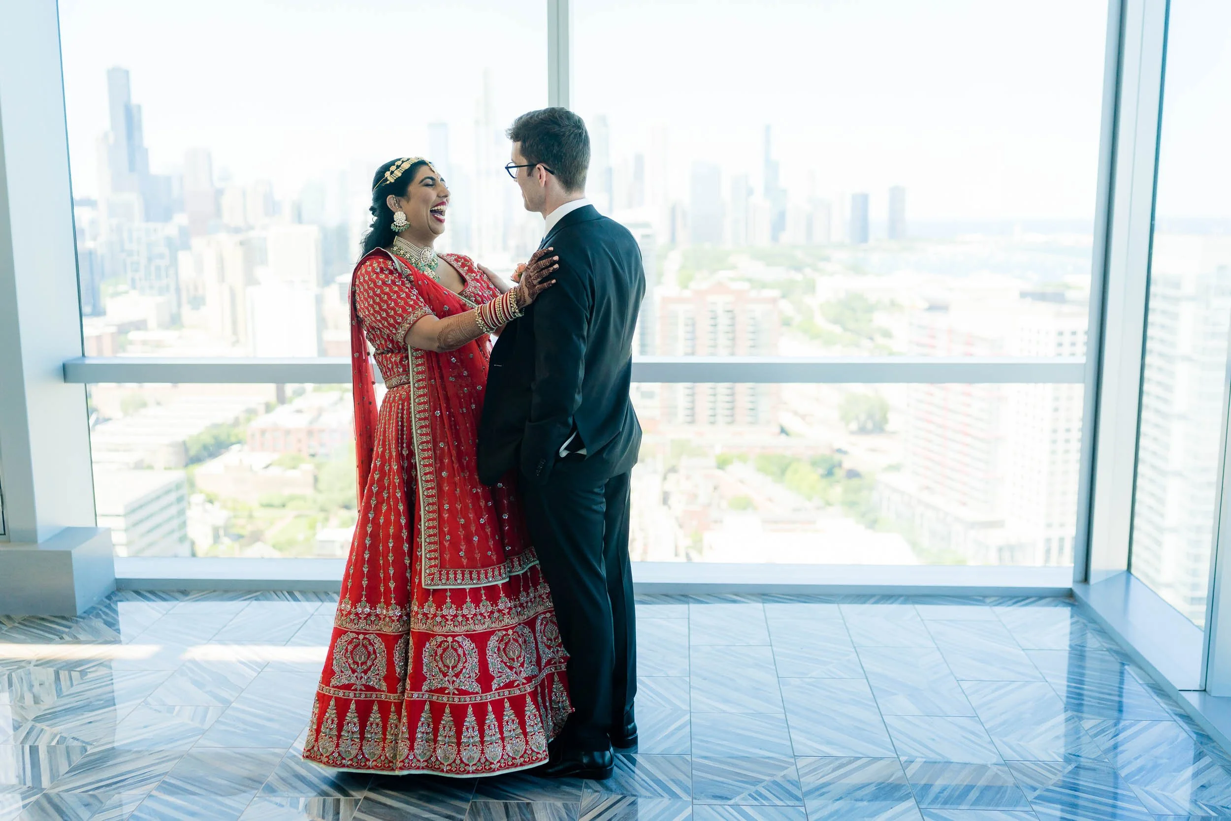 Their first look took place on the top floor, with sweeping views of downtown Chicago. It was quiet, intentional, and one of those moments where everything else fades away for a minute. A perfect way to ground the day before things picked up.