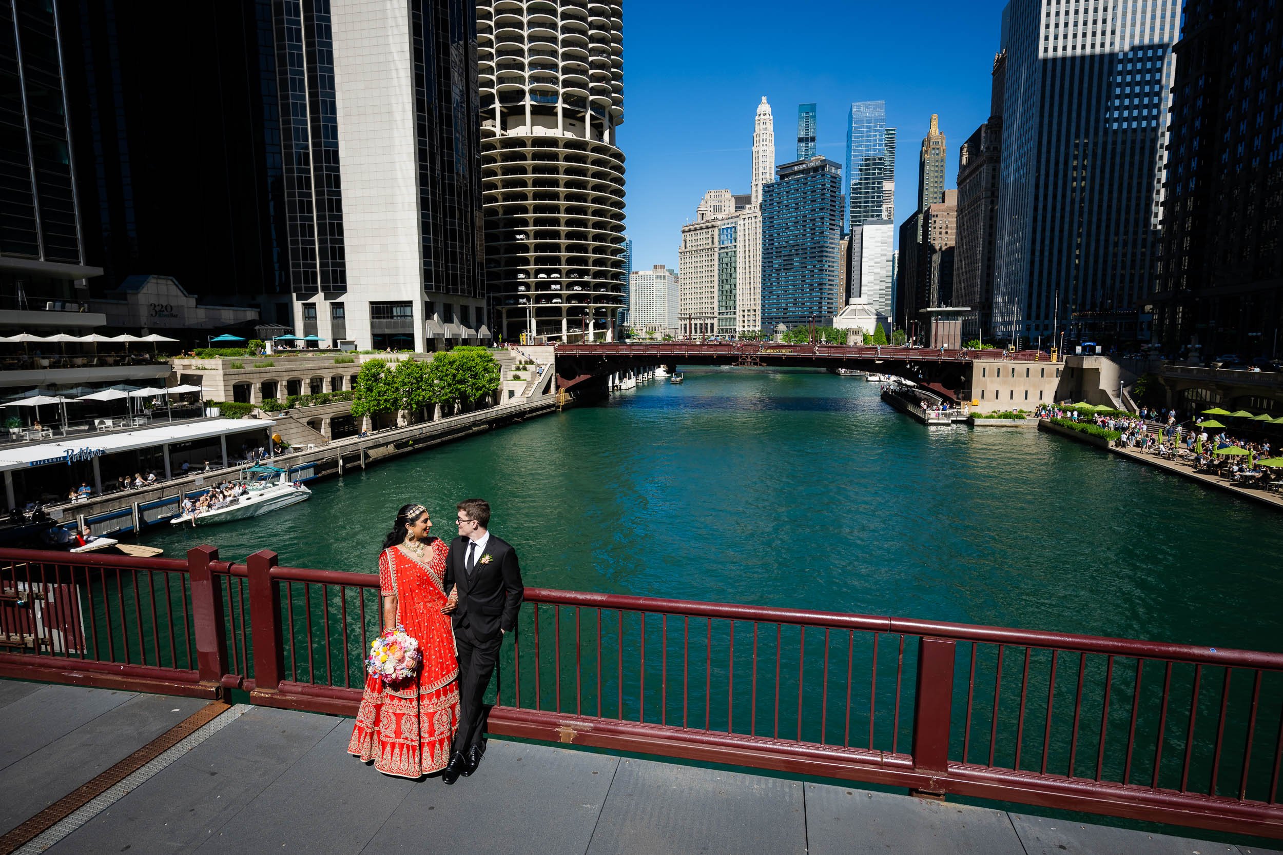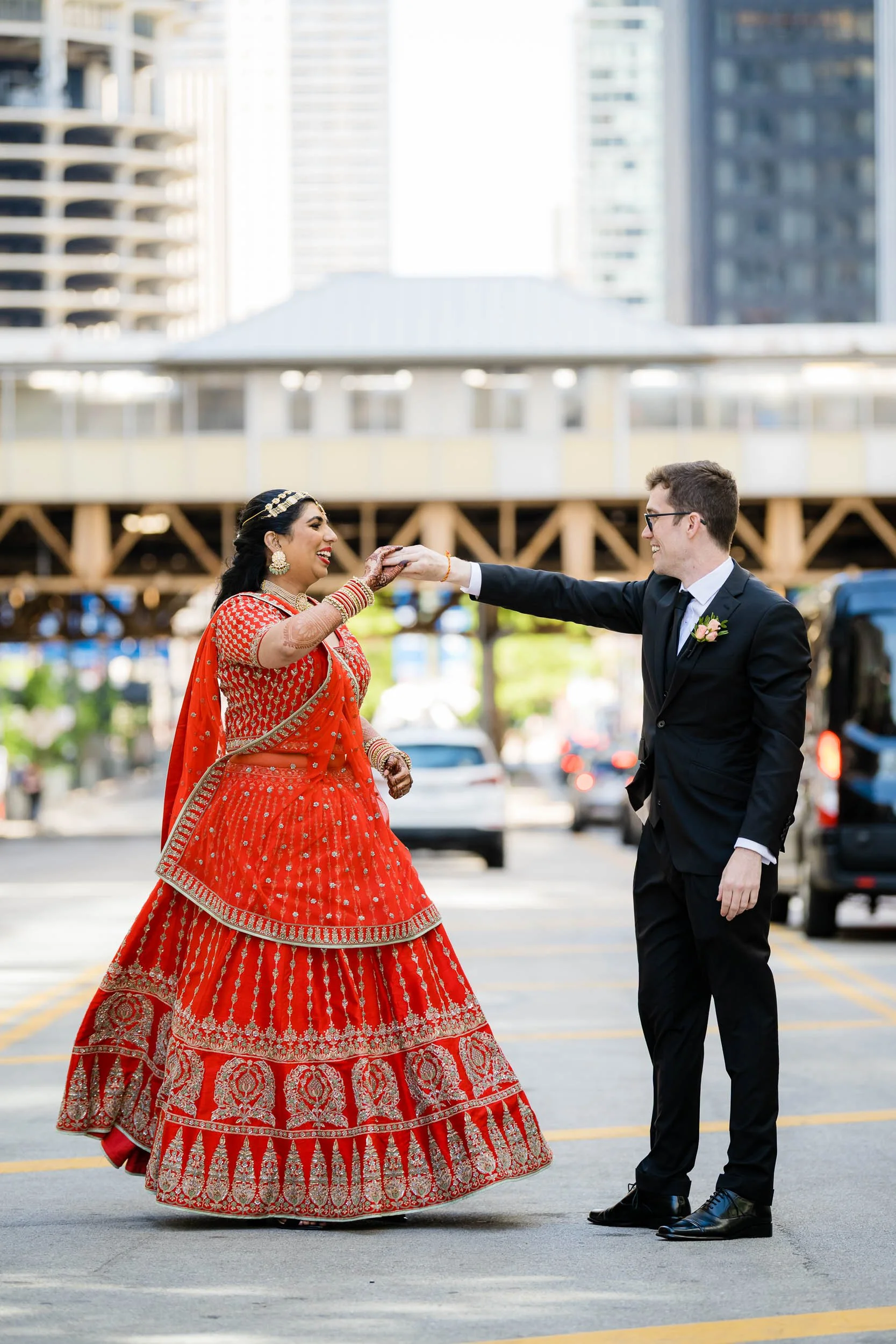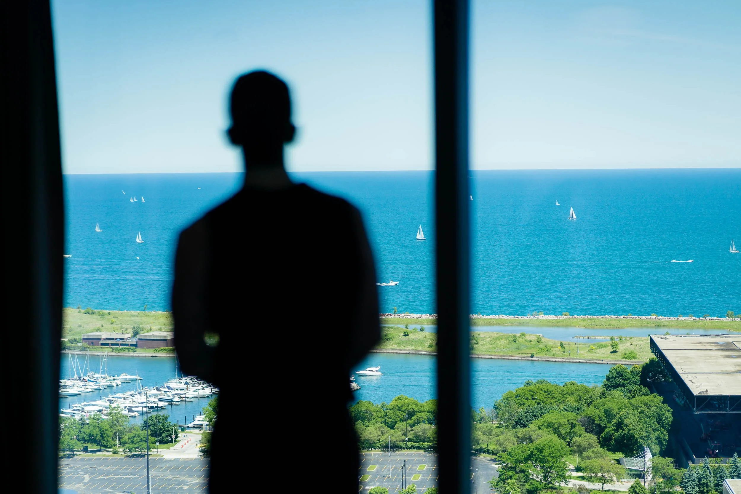 Their first look took place on the top floor, with sweeping views of downtown Chicago. It was quiet, intentional, and one of those moments where everything else fades away for a minute. A perfect way to ground the day before things picked up.