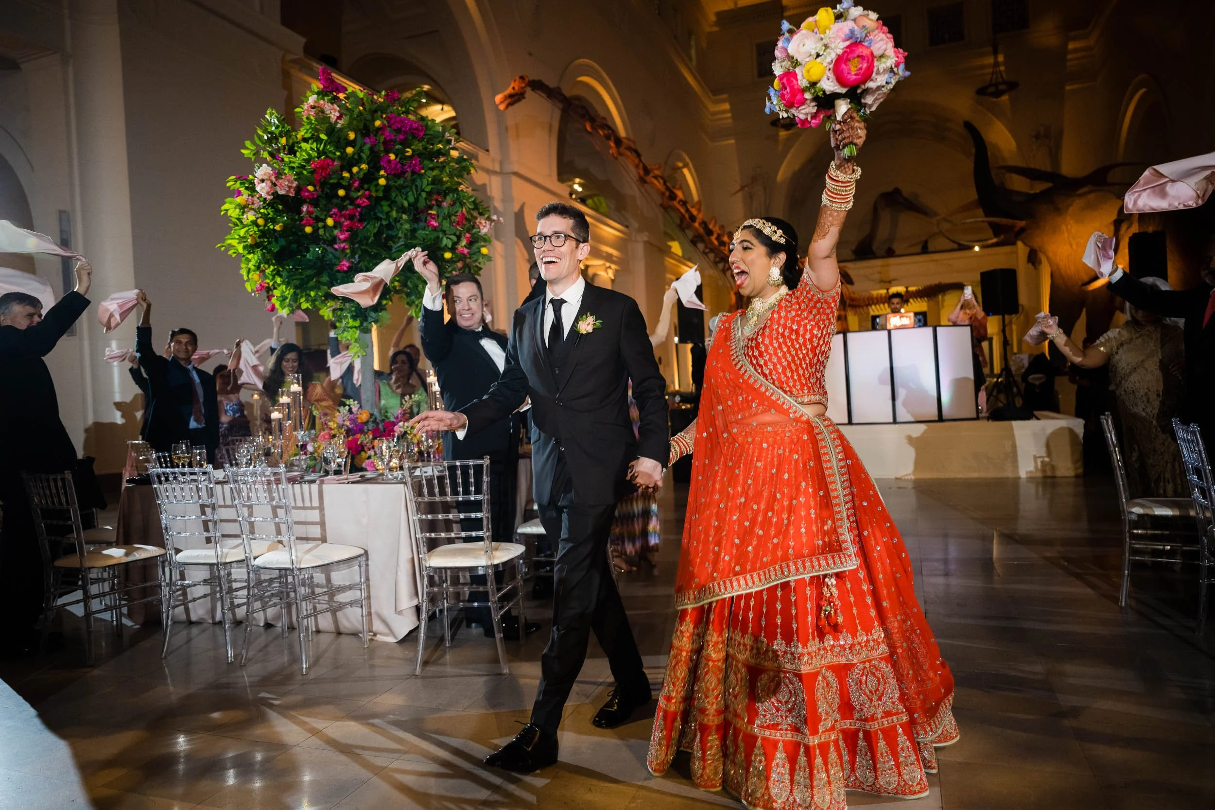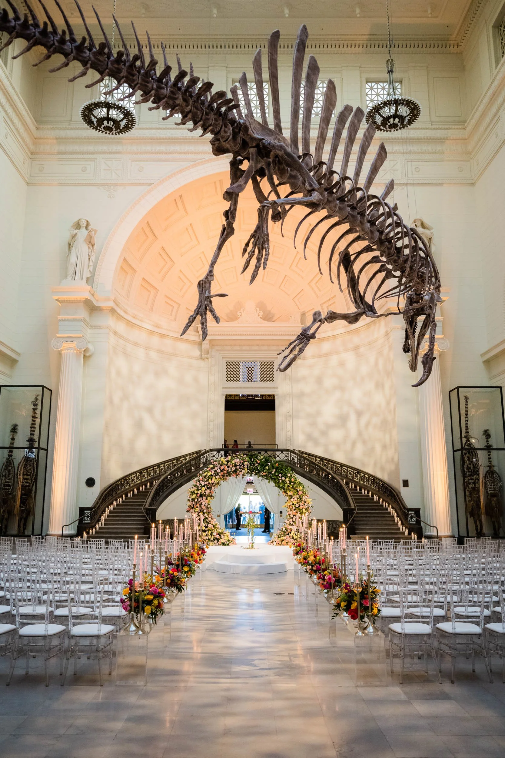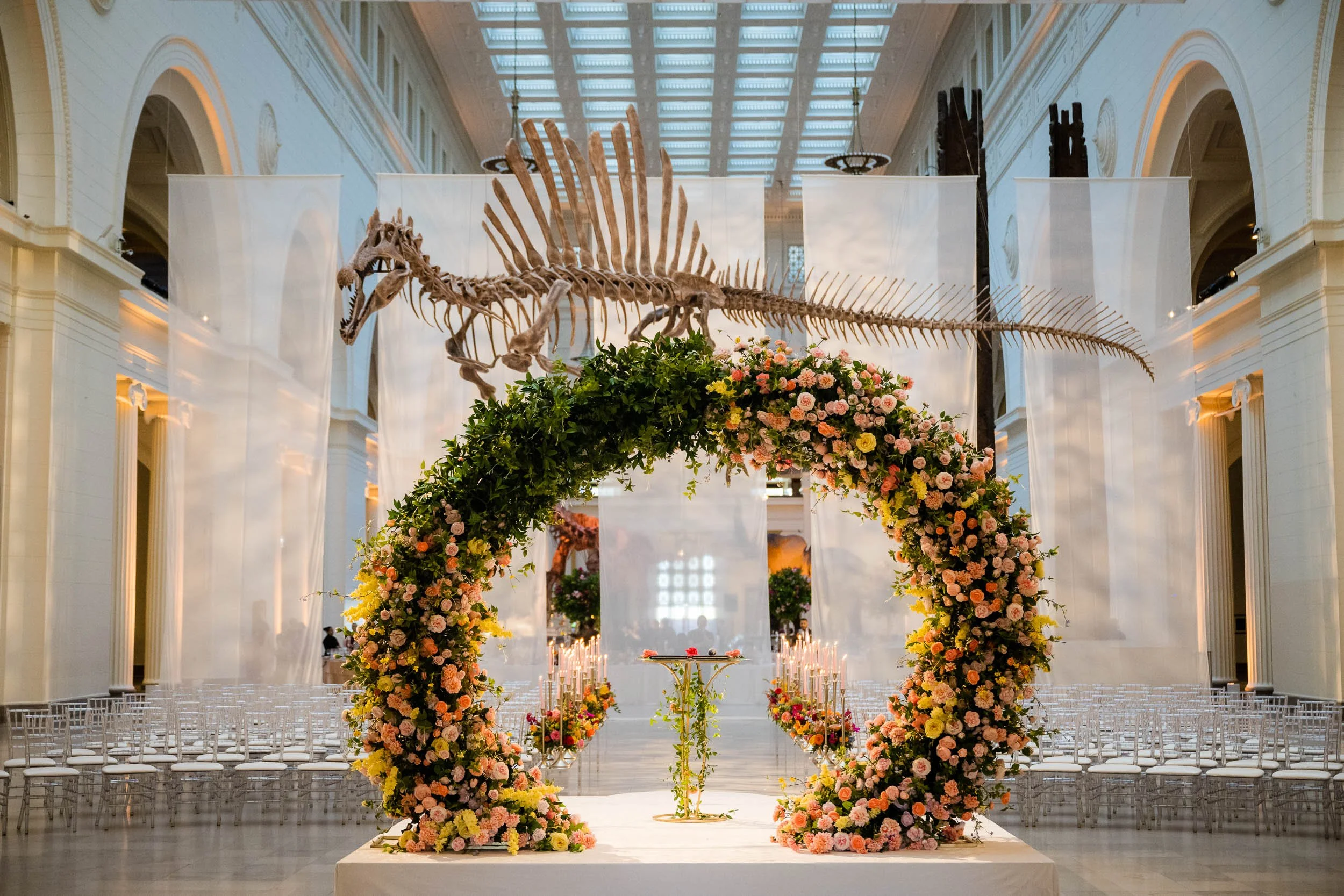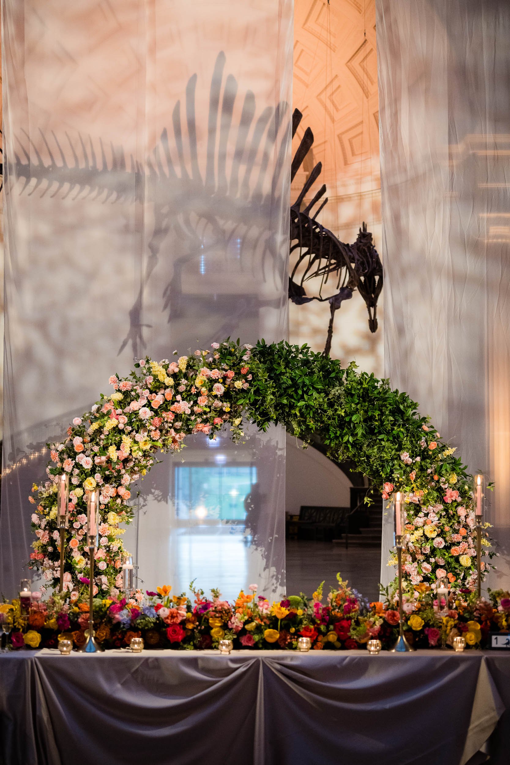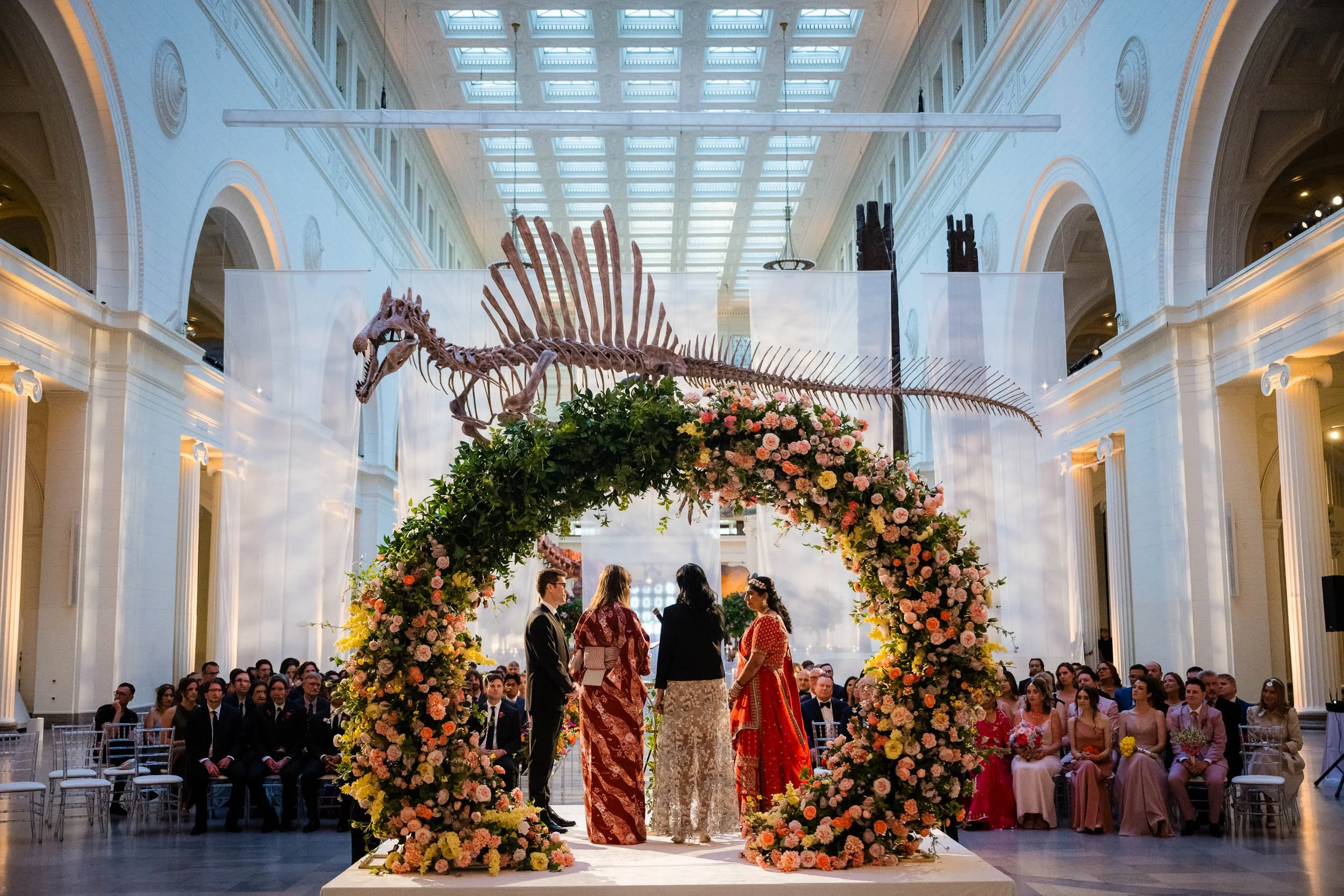 Set beneath the museum’s towering dinosaur skeletons, Divya and Adam exchanged vows under a floral arch bursting with color, designed by Yanni Designs. It was a perfect reflection of them—elegant, but never too serious.