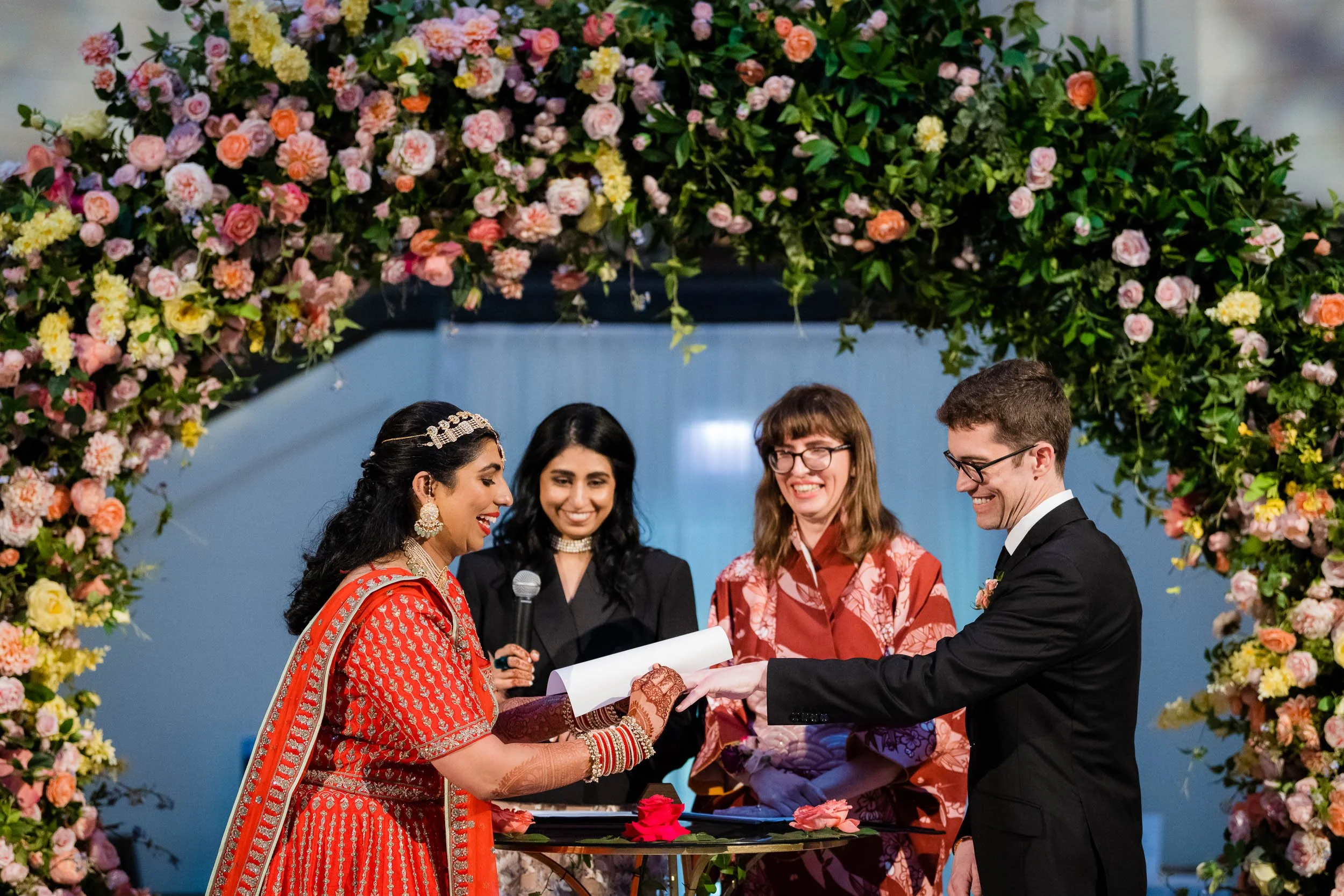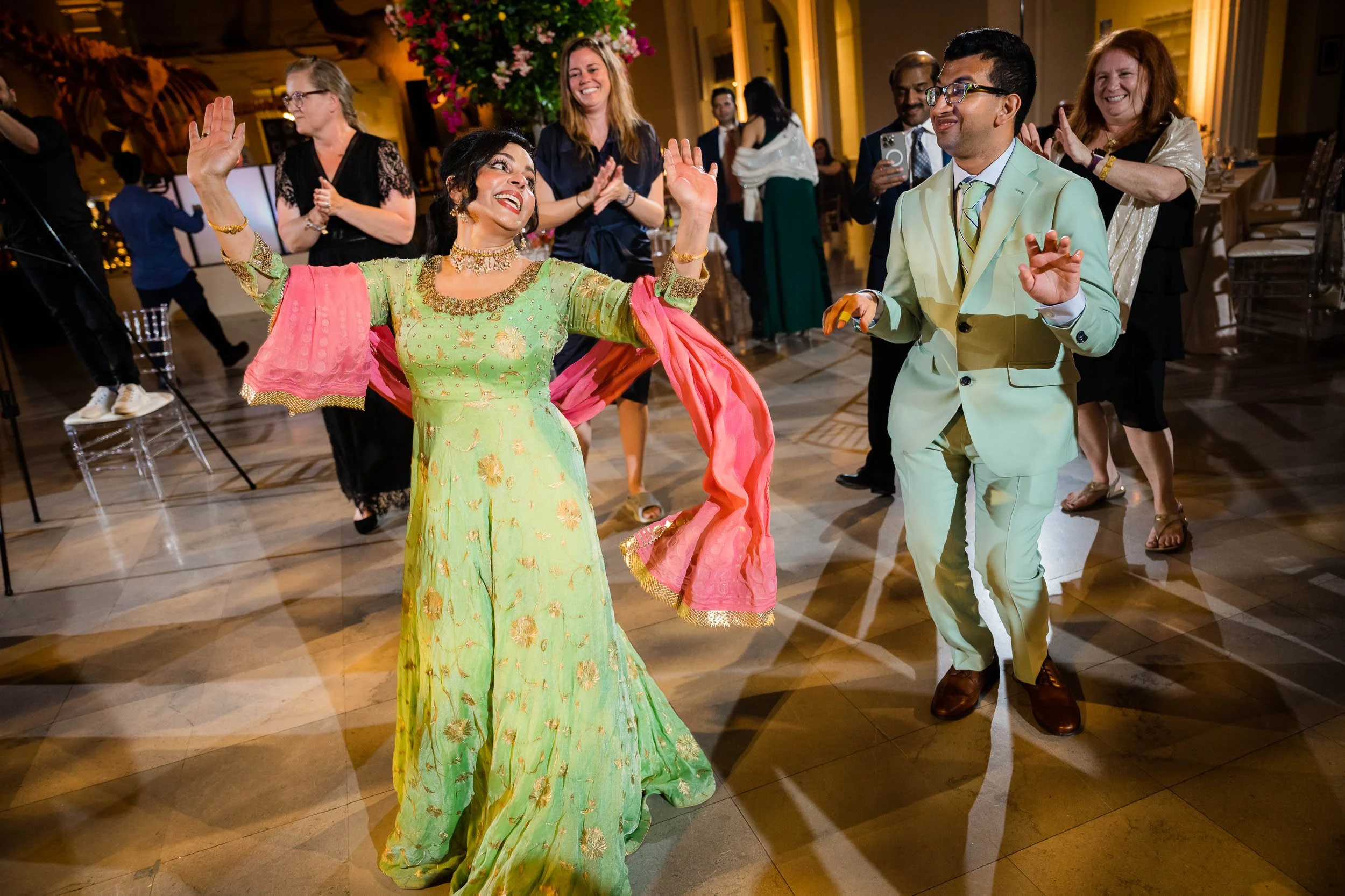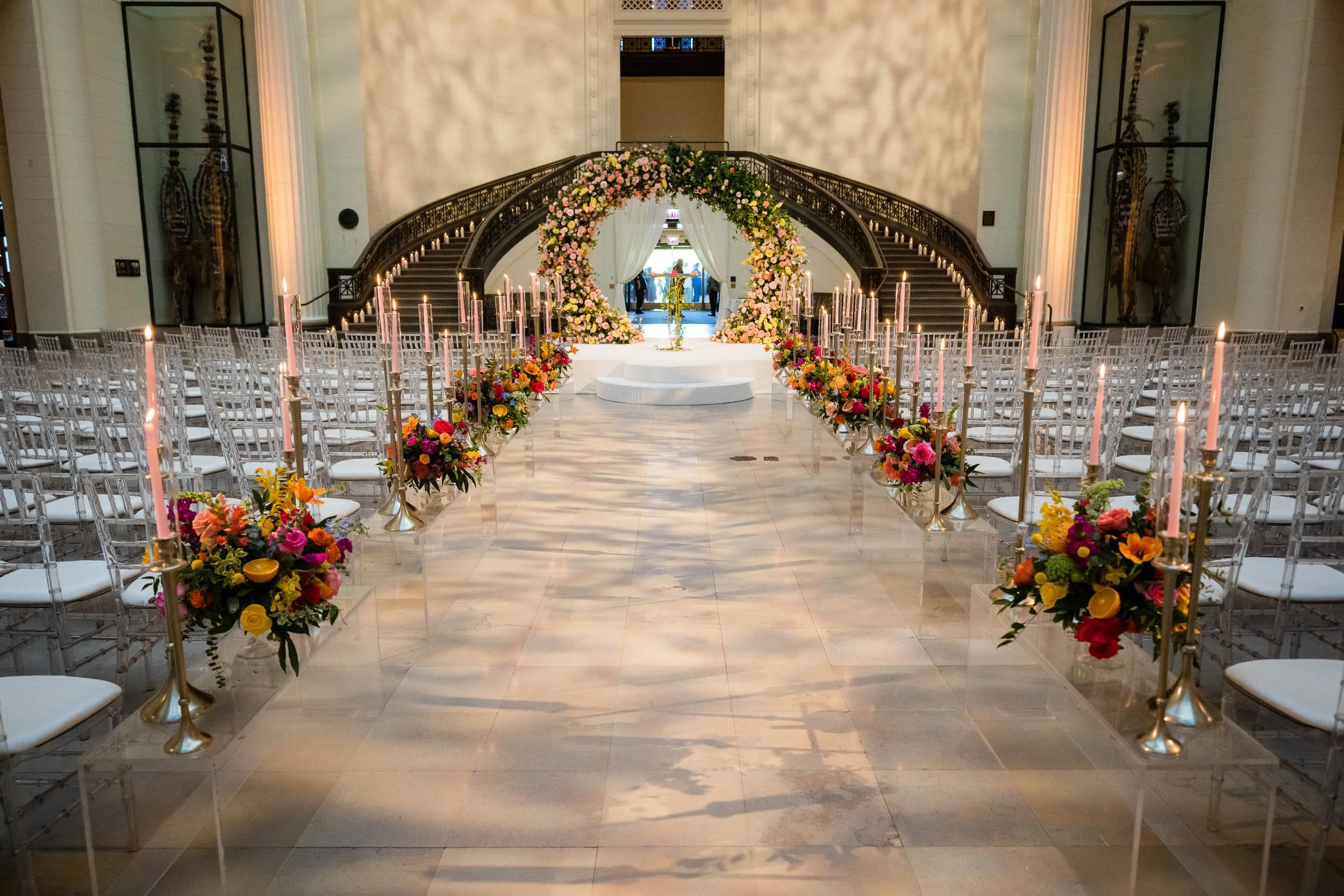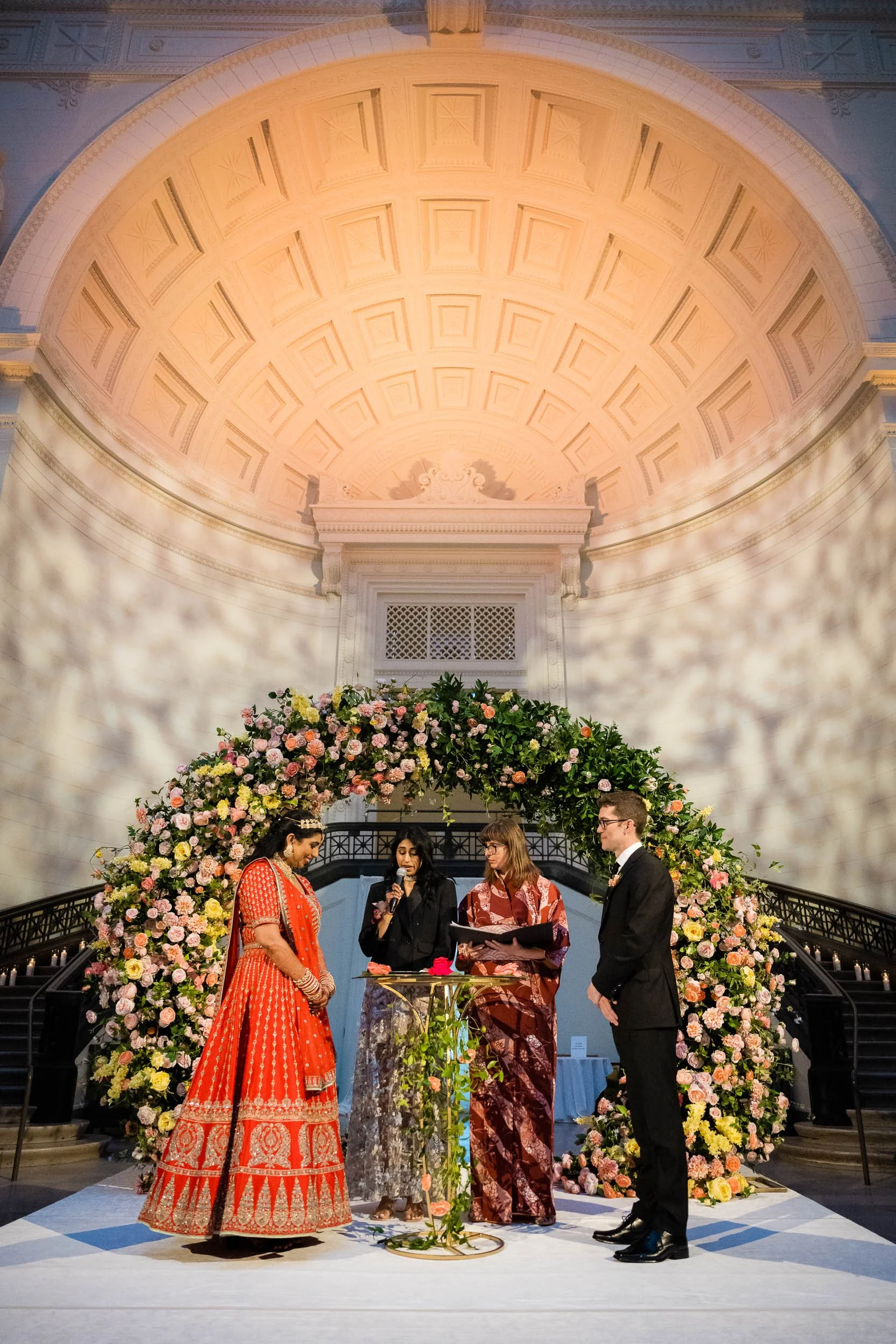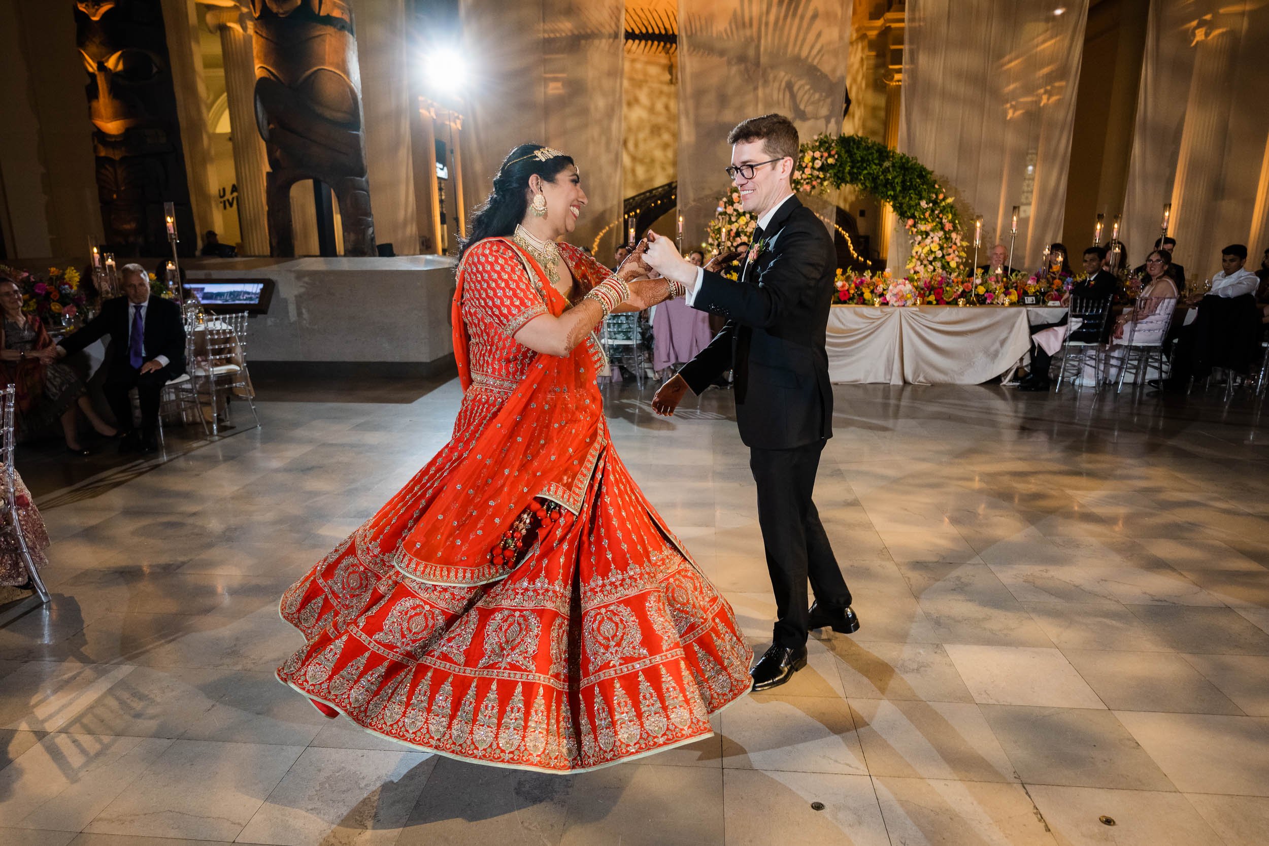 Set beneath the museum’s towering dinosaur skeletons, Divya and Adam exchanged vows under a floral arch bursting with color, designed by Yanni Designs. It was a perfect reflection of them—elegant, but never too serious.