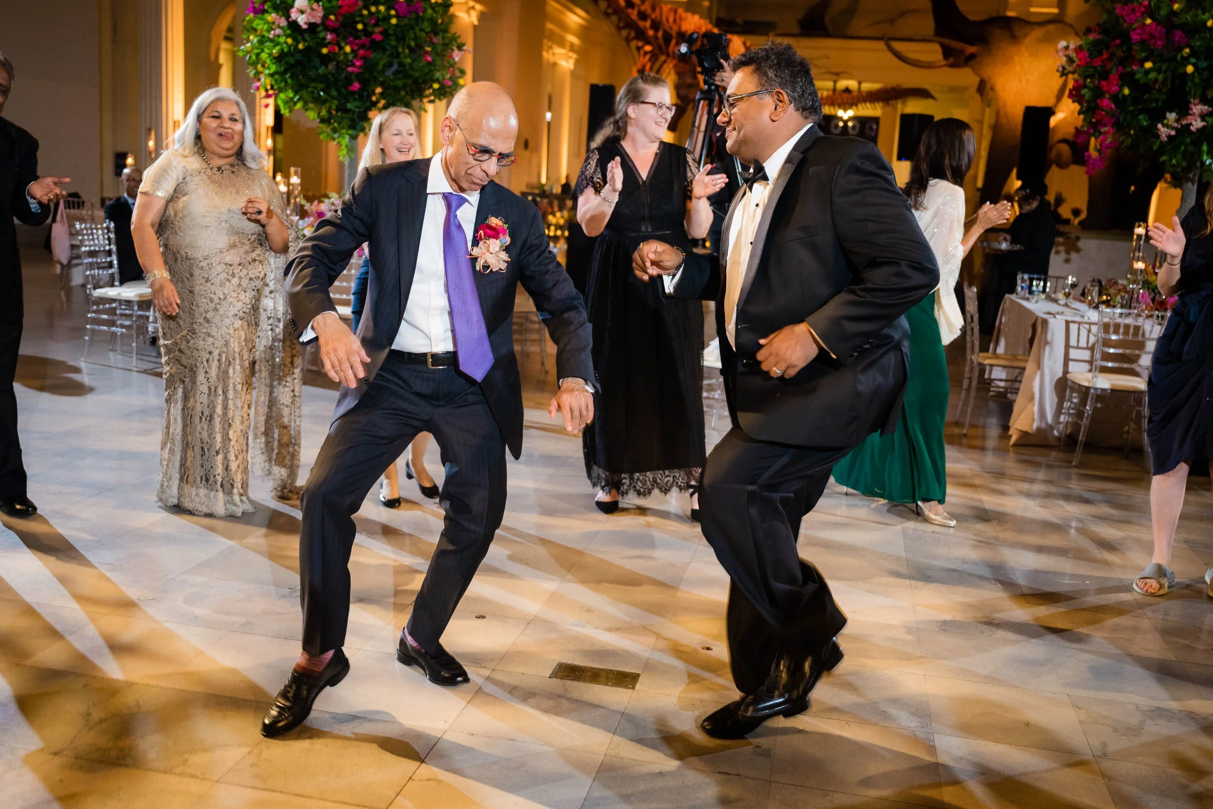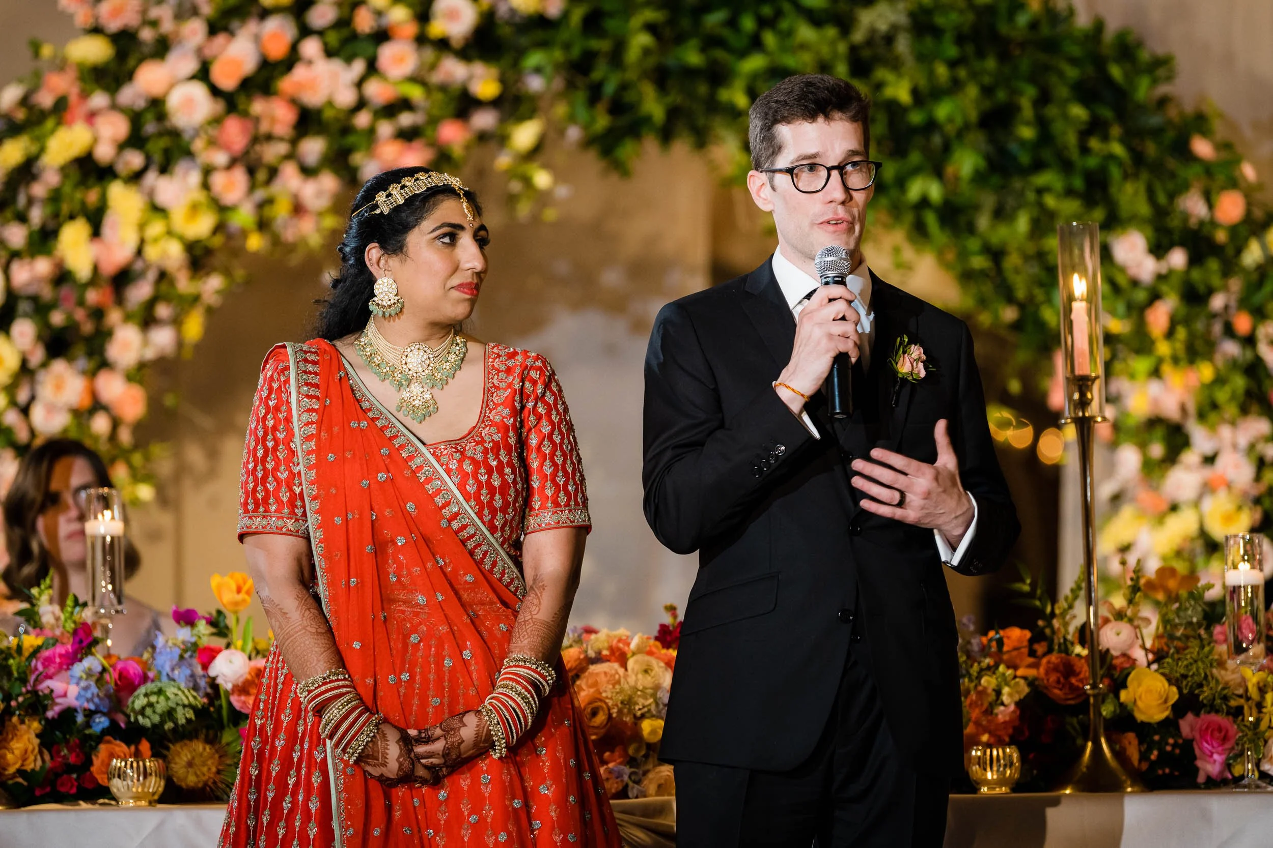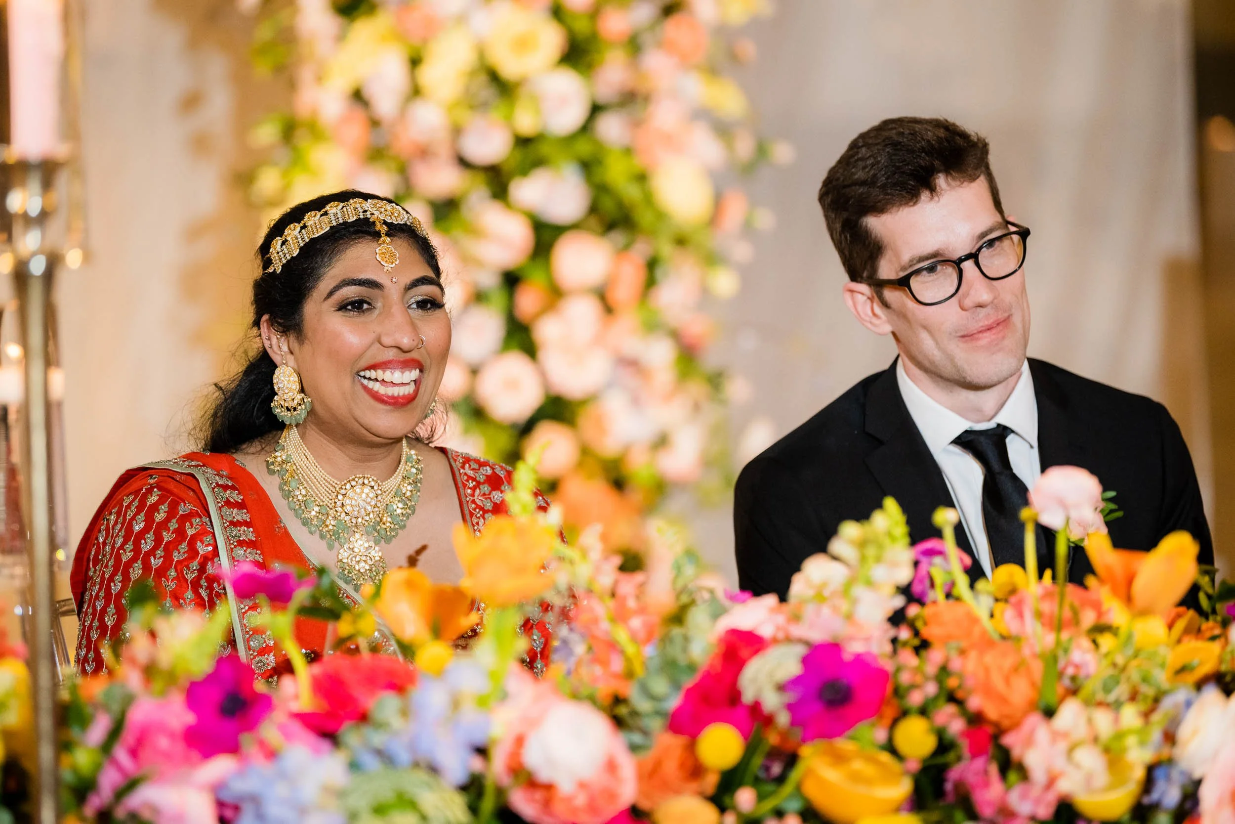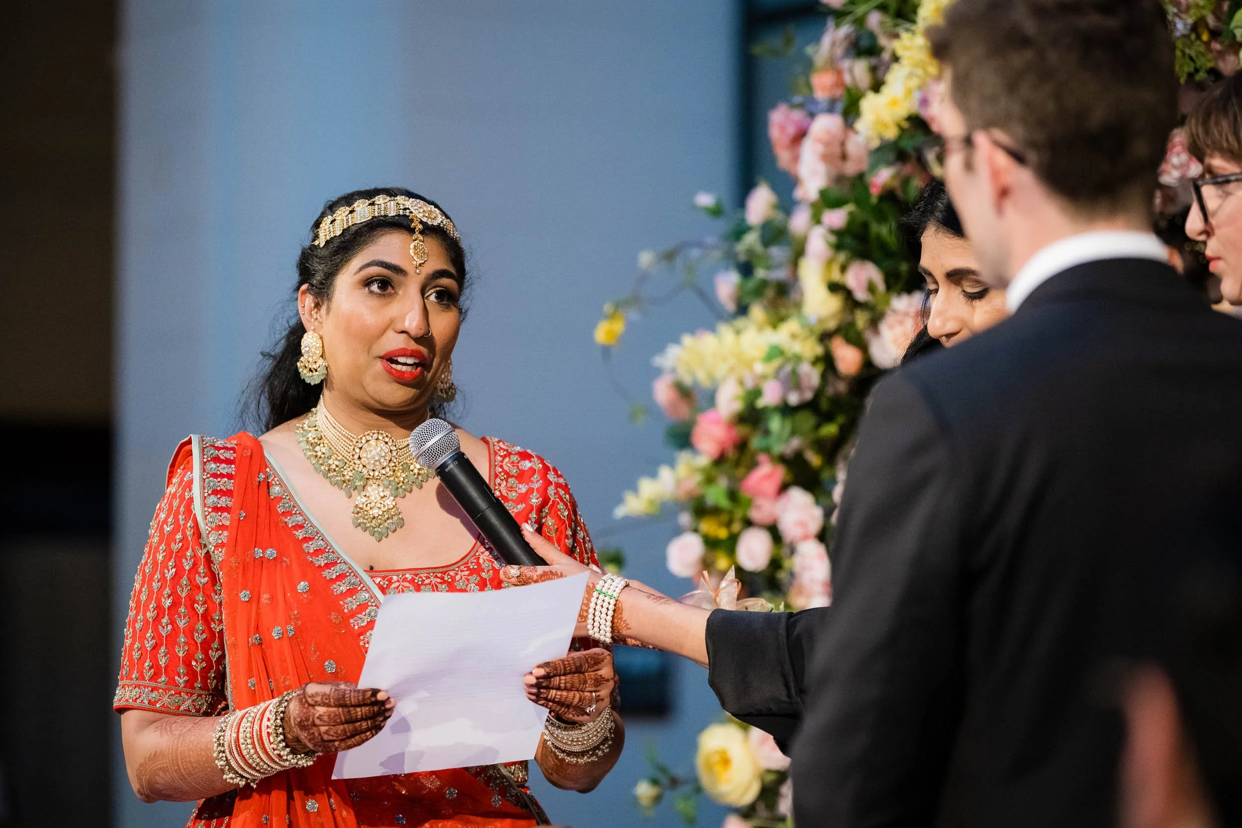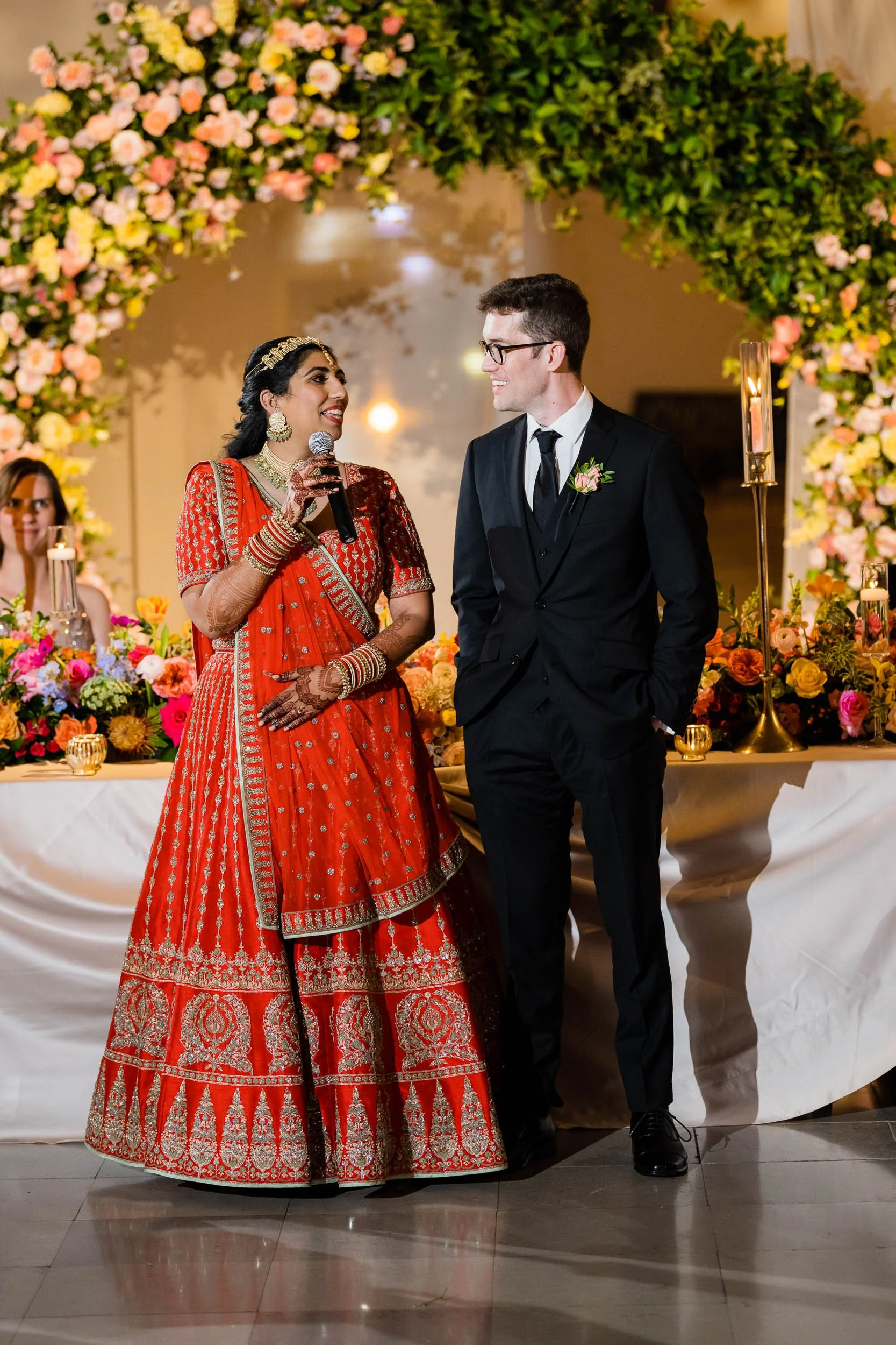 Set beneath the museum’s towering dinosaur skeletons, Divya and Adam exchanged vows under a floral arch bursting with color, designed by Yanni Designs. It was a perfect reflection of them—elegant, but never too serious.