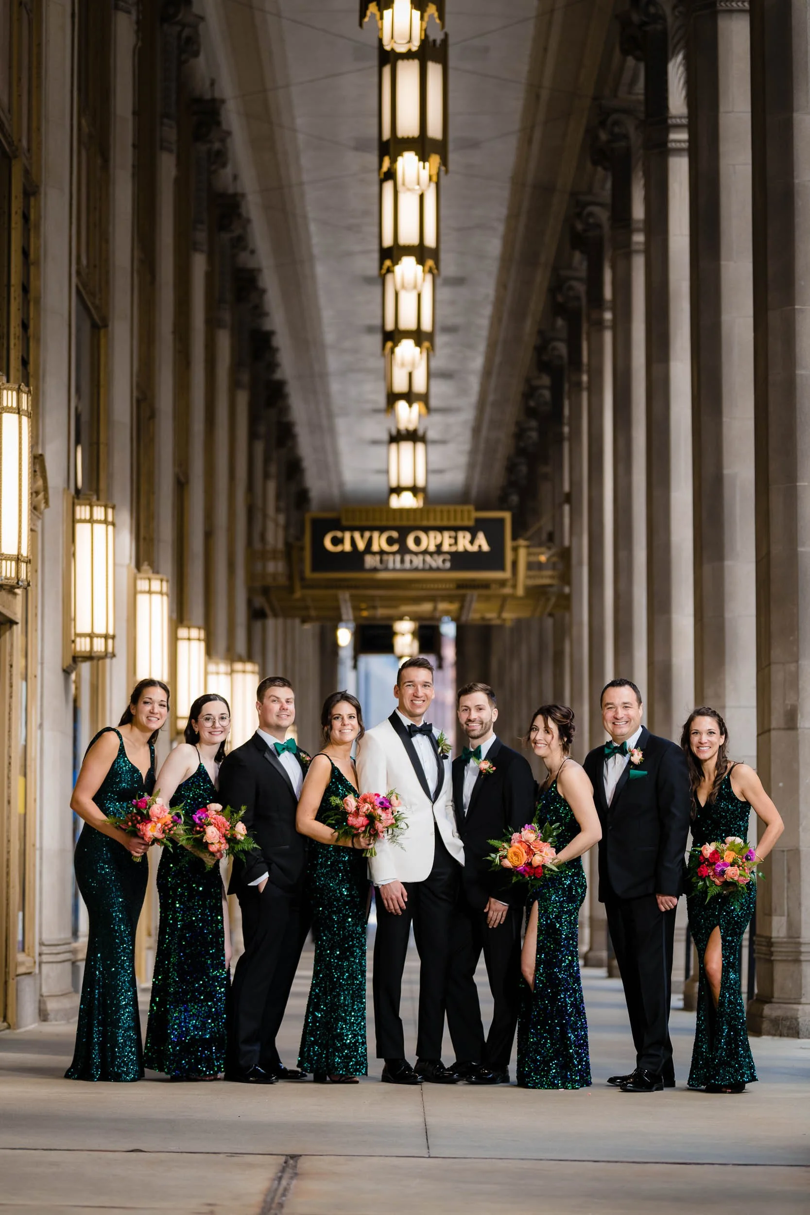 The day began with excitement and anticipation as I documented Wes and David getting ready alongside their family and wedding party at The LaSalle Chicago hotel. Their love for each other was palpable, and it was a delight to capture the bond they shared. With the perfect location right outside the hotel, we started our creative wedding party photos with the iconic view of the Chicago Board of Trade. As we strolled through downtown, capturing candid moments along the way, we stumbled upon a wonderfully colorful art installation that served as a perfect and unique backdrop for the grooms and their attendants. Continuing our journey, we made our way to another Chicago classic, the Lyric Opera House, where the majestic columns framed the wedding party flawlessly.