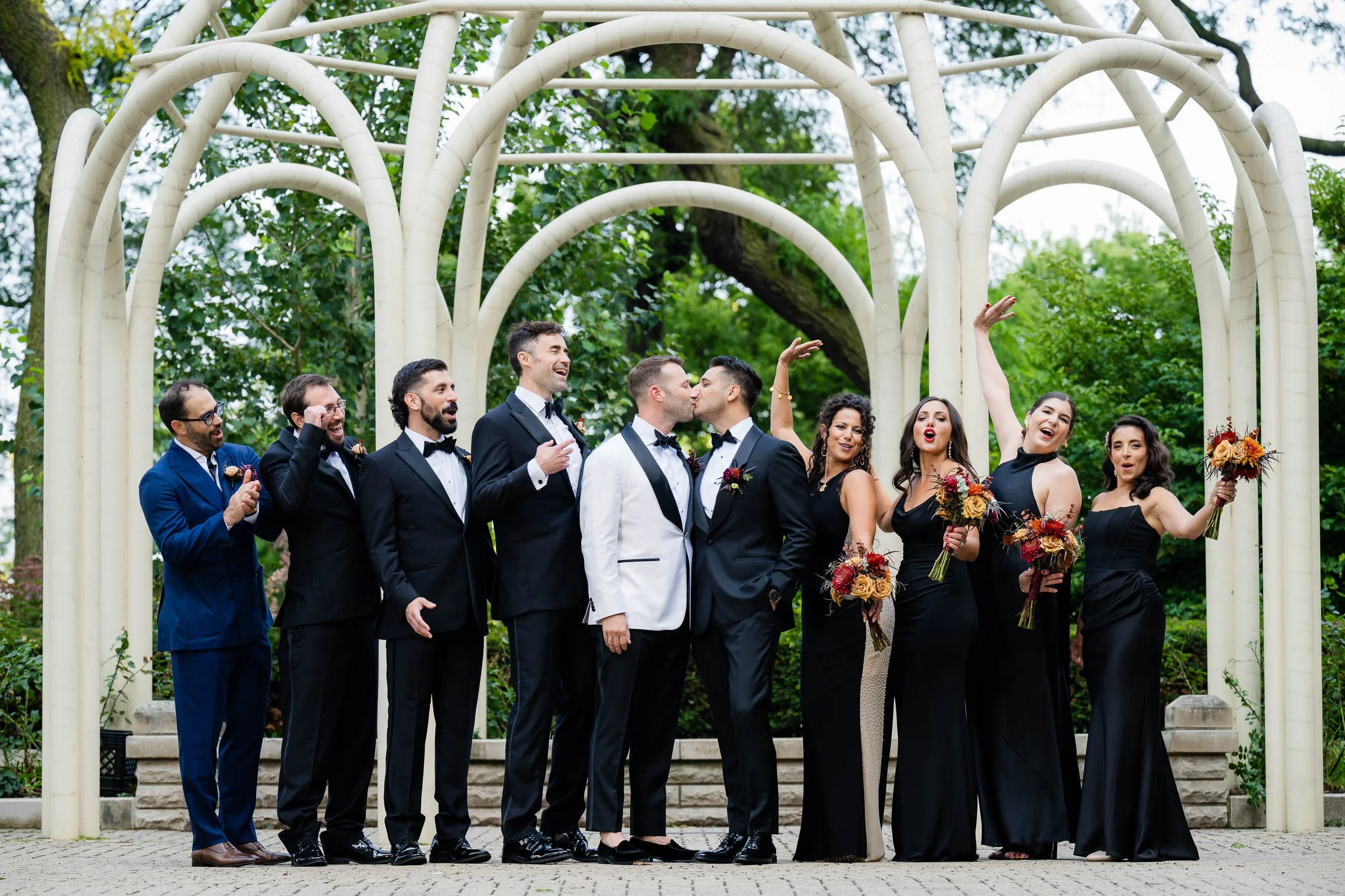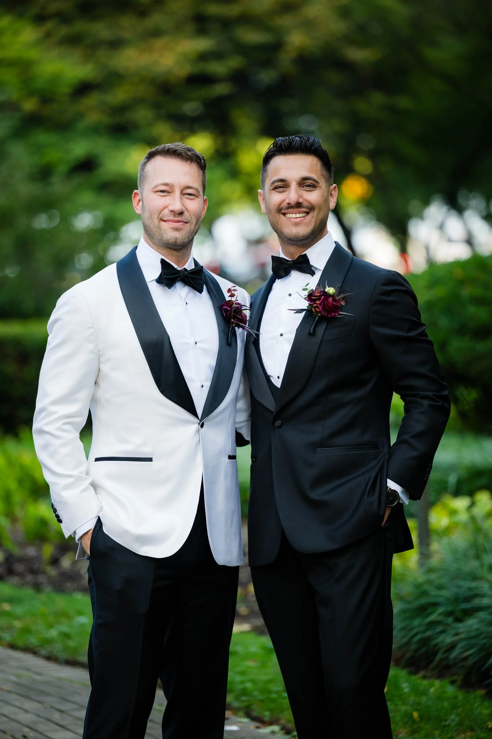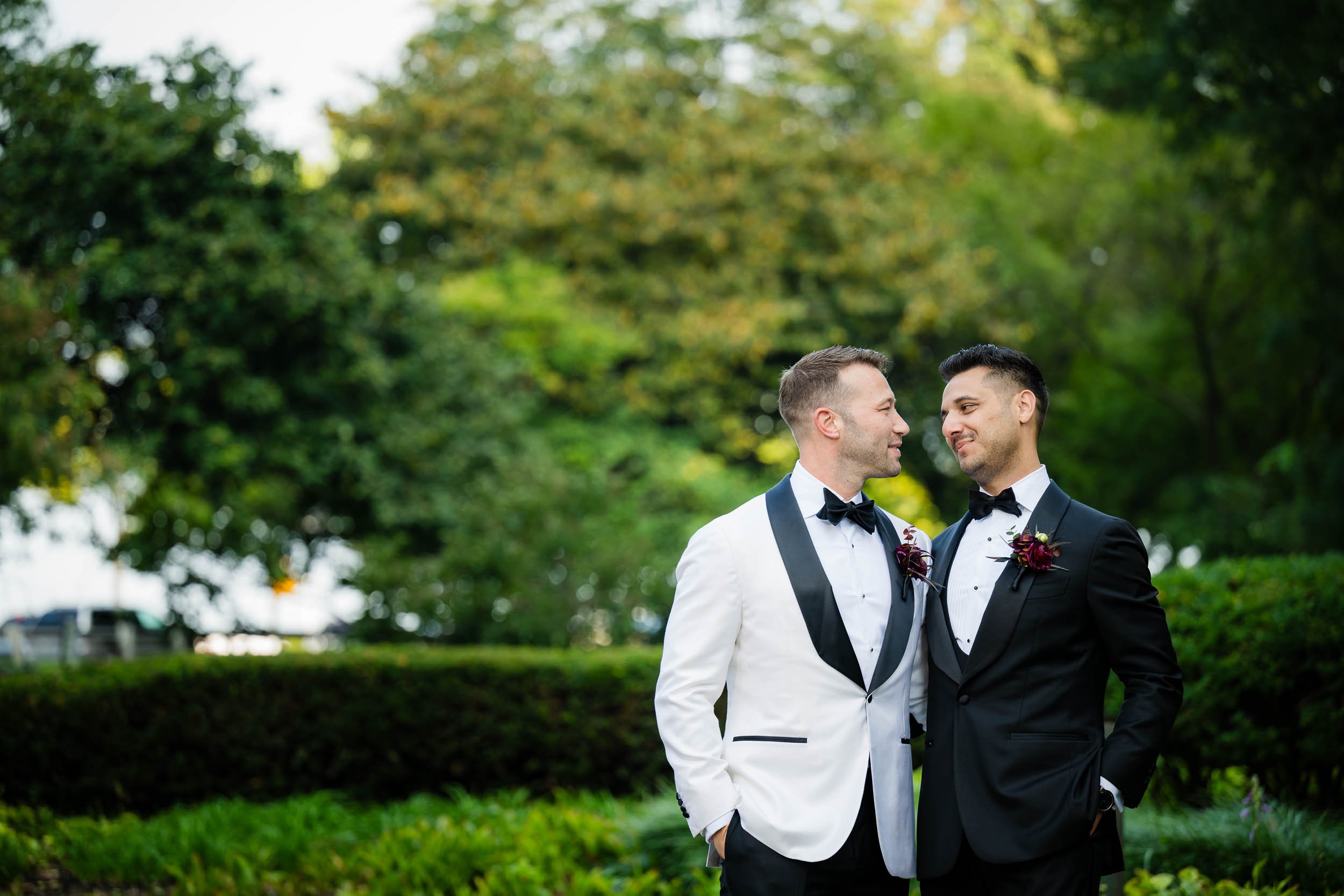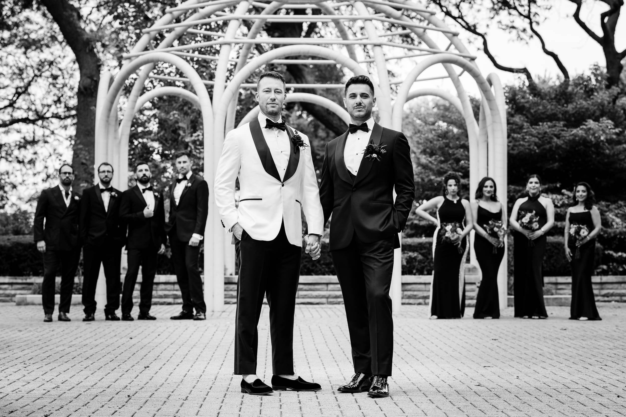 We crossed the street for portraits at Lakefront Park, which is perfect spot for Drake couples. Just a little slice of green space nestled in the hustle of North Michigan Avenue. The wedding party understood the assignment. Fun, over-the-top in the best way, and completely themselves — which is exactly how authentic wedding photos happen. Sending the wedding party on their way, I spent a little time photographing just the grooms, where Nick & Ed’s true feelings for each other shone through in the images.