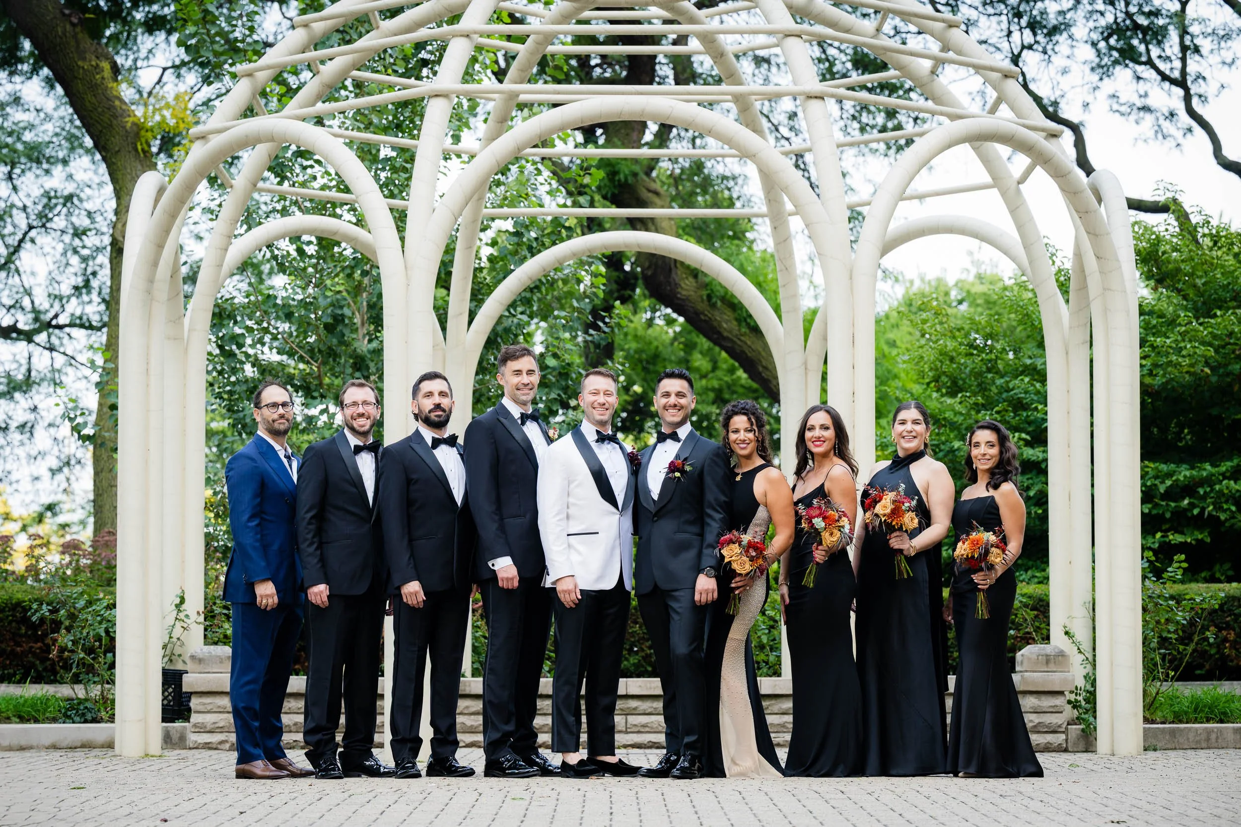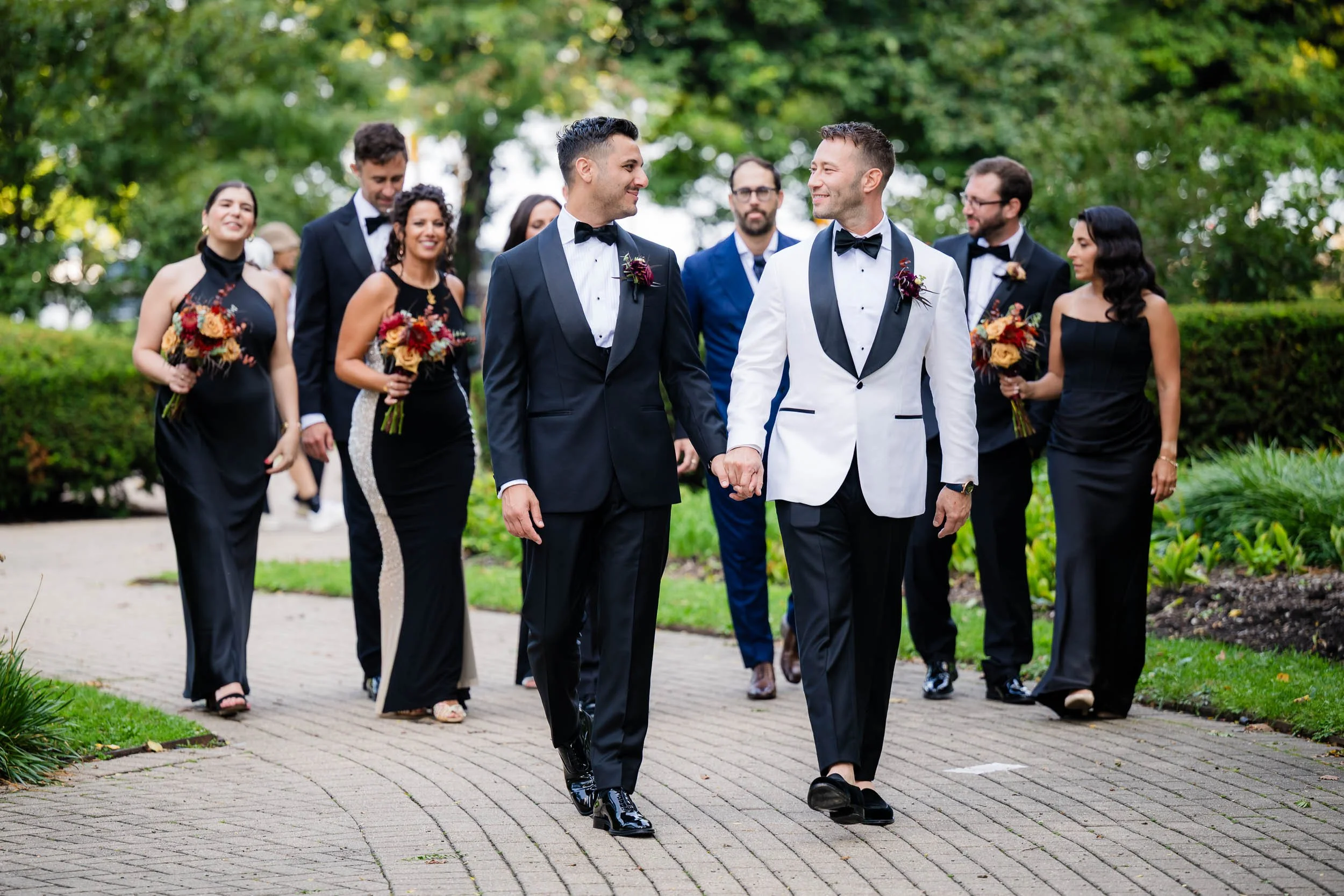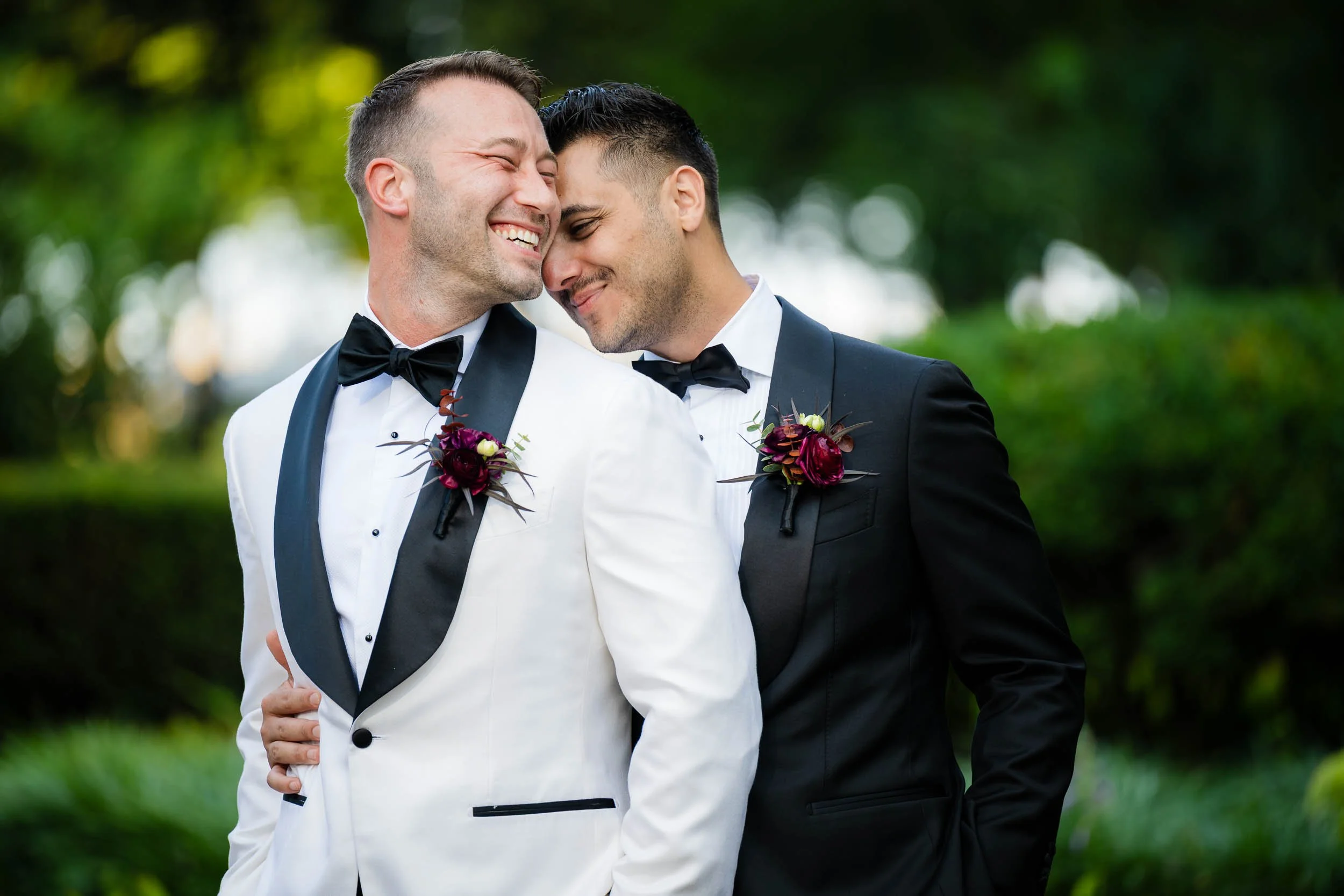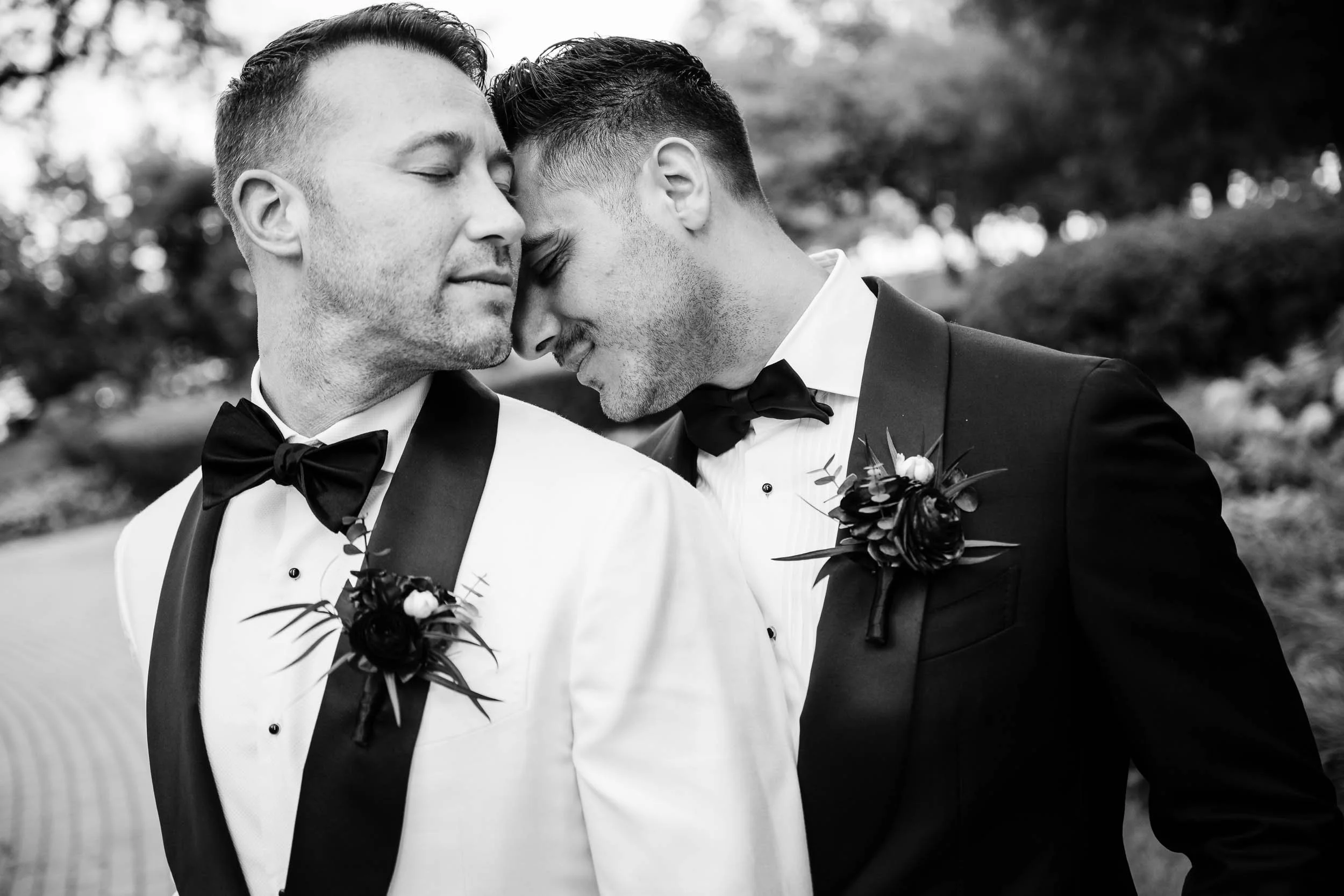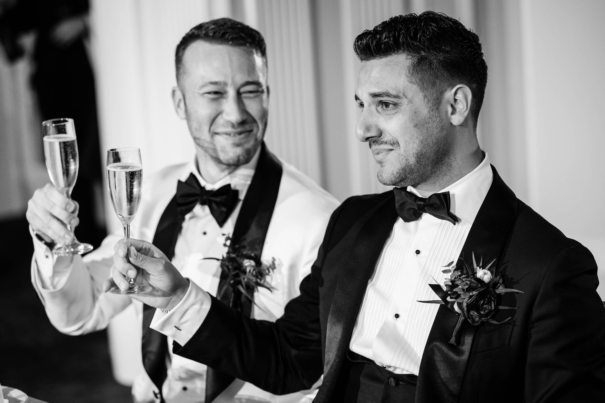 We crossed the street for portraits at Lakefront Park, which is perfect spot for Drake couples. Just a little slice of green space nestled in the hustle of North Michigan Avenue. The wedding party understood the assignment. Fun, over-the-top in the best way, and completely themselves — which is exactly how authentic wedding photos happen. Sending the wedding party on their way, I spent a little time photographing just the grooms, where Nick & Ed’s true feelings for each other shone through in the images.