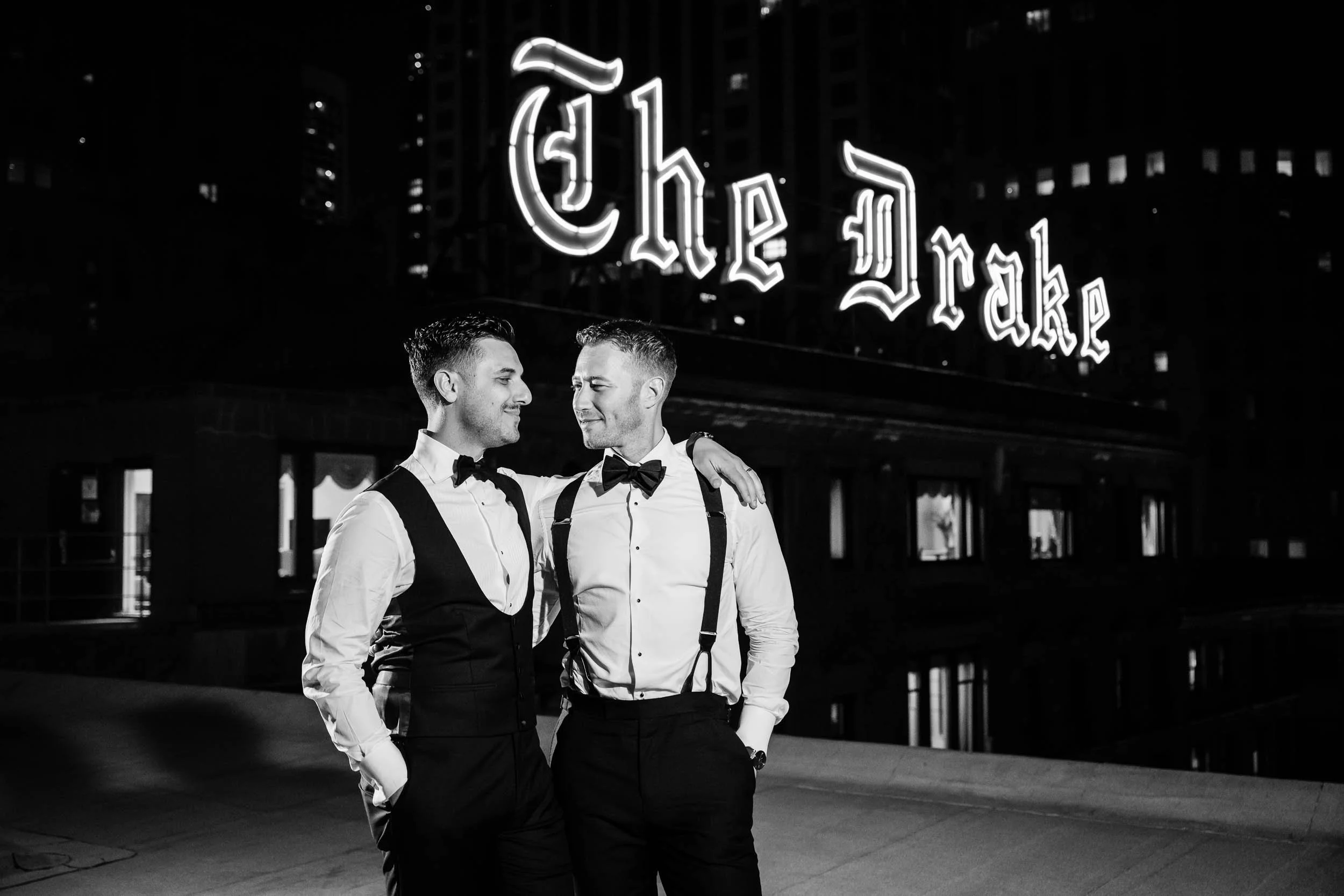 We ended the night upstairs with rooftop portraits under The Drake’s glowing neon sign — a true Chicago classic, no notes. Nicholas and Edward’s day is proof that when you let yourself be fully present, the photos take care of themselves.