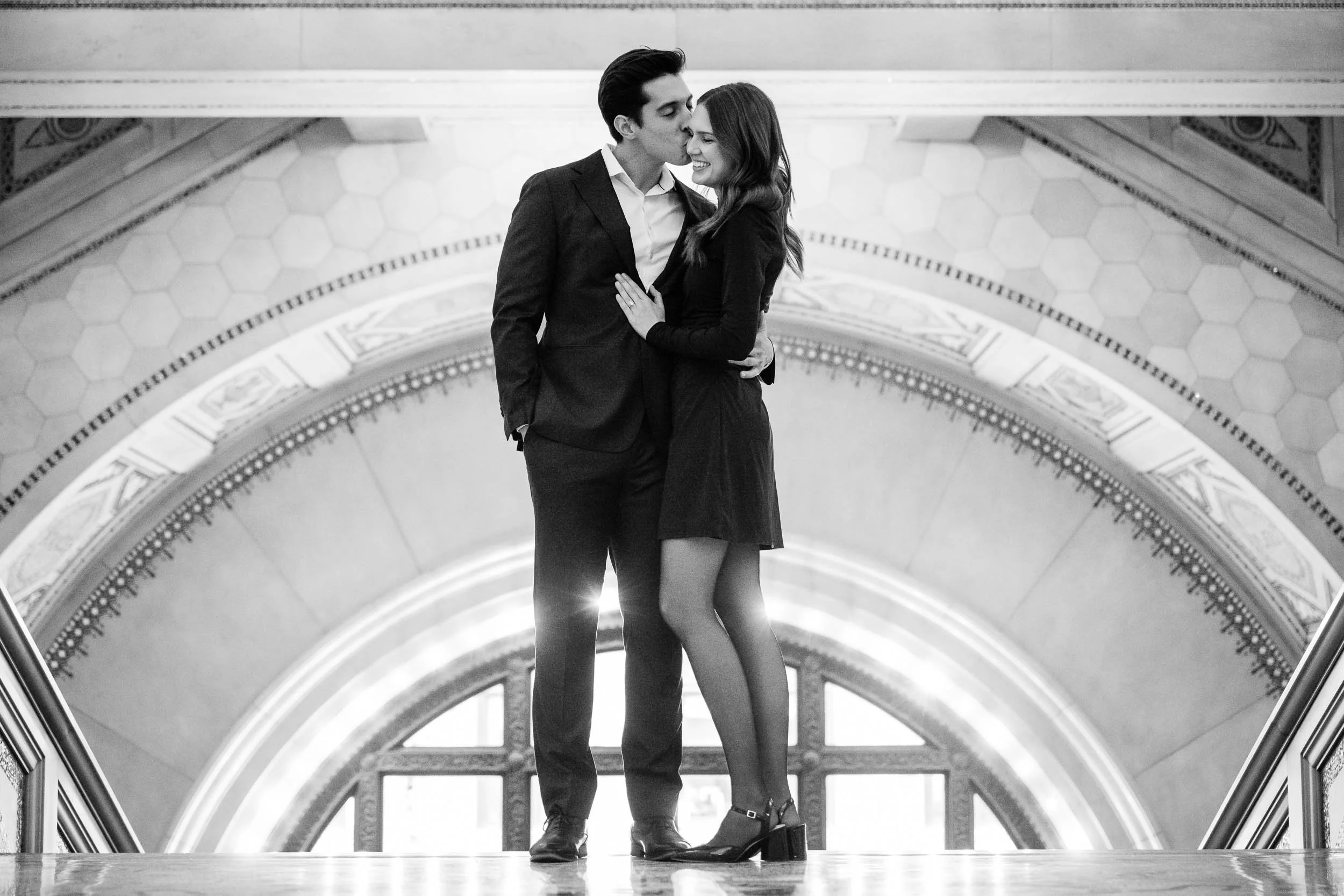 With temperatures on the colder side, we made sure to keep things moving to keep Maddie and Sam comfortable. They dressed for the weather in a classy and elegant way. The soft, overcast sky provided beautifully flattering light, adding to the romantic winter atmosphere. We even took a quick break inside a nearby Starbucks to warm up before heading back out for more portraits.